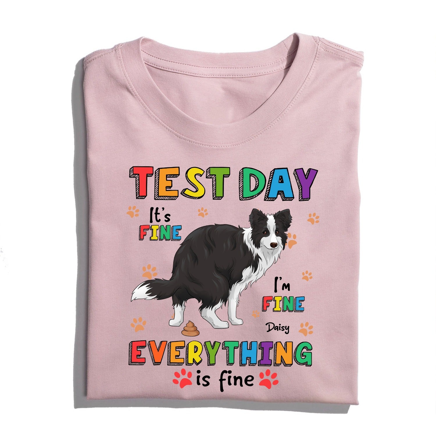 Love dogs and appreciate a good laugh? This fun and quirky T-shirt is just what you need! The design shows a playful pup standing proudly with its butt in the air, leaving behind a trail of colorful poop because sometimes life gets messy, and you’ve got to find the humor in it! Paired with the cheerful and relatable quote “Test Day. It’s Fine. I’m Fine. Everything Is Fine.”, this tee brings a lighthearted vibe to those chaotic, stress-filled days.
