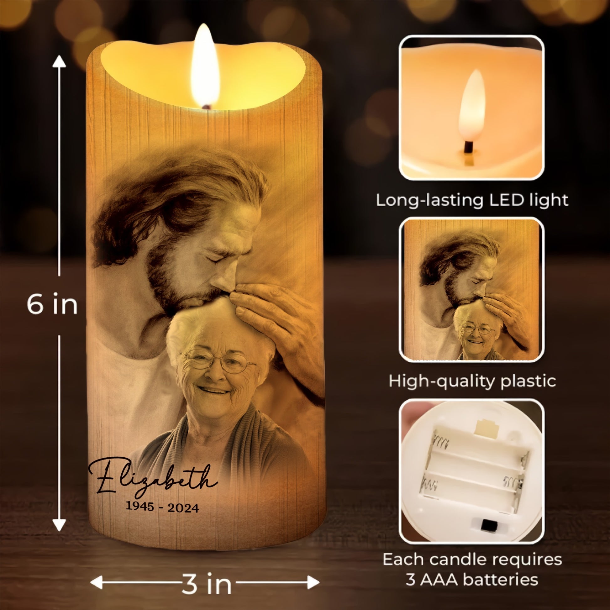 Honor the memory of a loved one with this LED Memorial Candle, a beautiful tribute that brings warmth and solace. The front of the candle tenderly depicts your beloved in the embrace of God, symbolizing eternal peace. Personalize this keepsake with their photo, name, and commemorative year, creating a deeply personal and meaningful memorial.