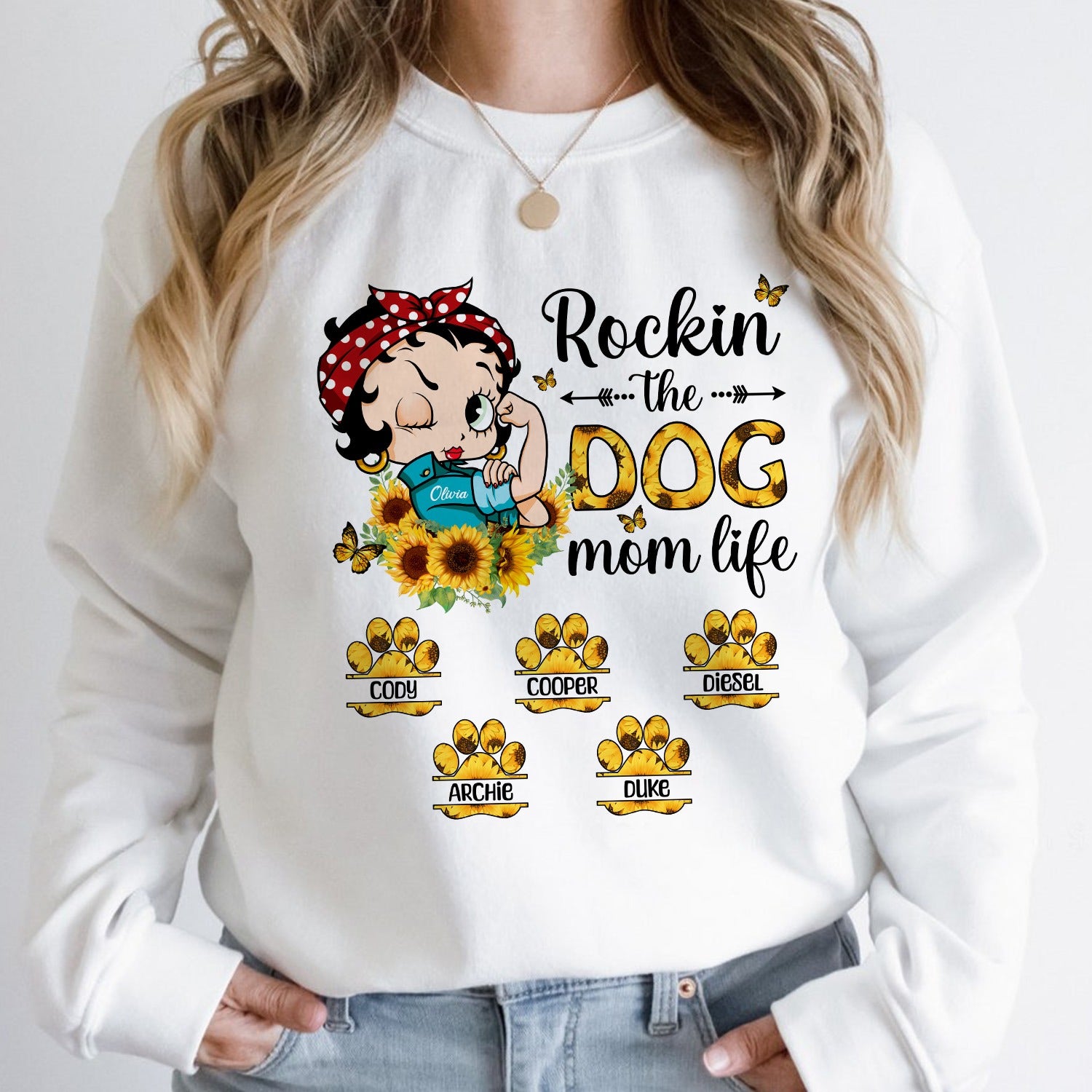 This sweatshirt is perfect for girls and moms who love their dogs, especially those who admire the iconic style of Betty Boop. Designed for modern women, the sweatshirt features the message “Rockin The Dog Mom Life” alongside an illustration of a glamorous girl inspired by Betty Boop. The girl exudes both elegance and strength, striking a pose that shows off her muscles, with a cute hair accessory on her head. In front of her are bright sunflowers, and beneath her are playful dog paw prints, highlighting her love for her furry friends.