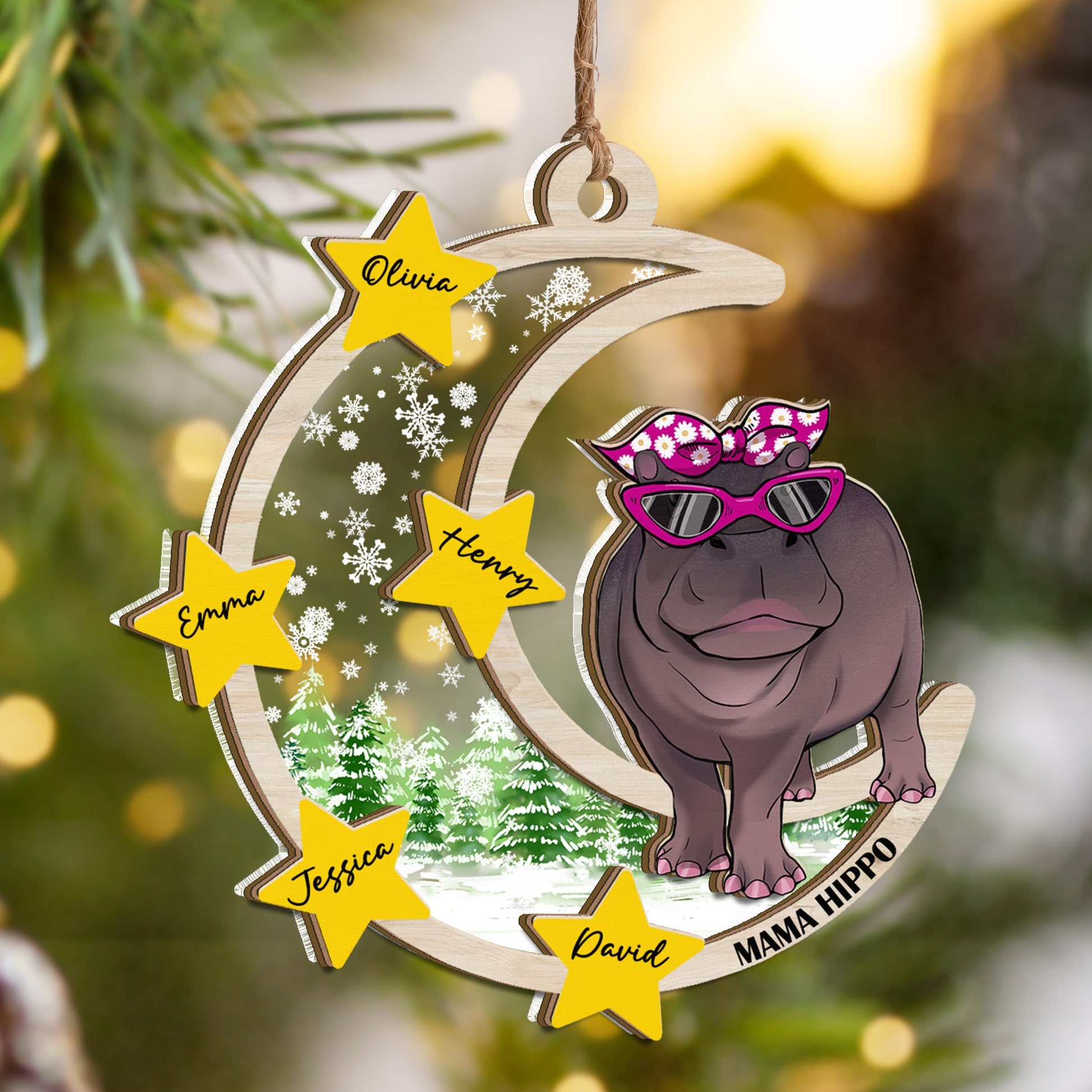 Celebrate the unbreakable bond of family with this heartfelt 2-Layered Wooden and Acrylic Ornament, designed especially for mothers. Shaped like a crescent moon, the ornament features an adorable mother hippo, stylishly wearing a bow and glasses, standing proudly on the crescent. This charming piece brings warmth and love to your holiday decorations, making it a perfect keepsake for Christmas. The stars scattered across the moon each represent a child, and you can personalize the number of stars and add the names of each child, making this ornament uniquely yours.