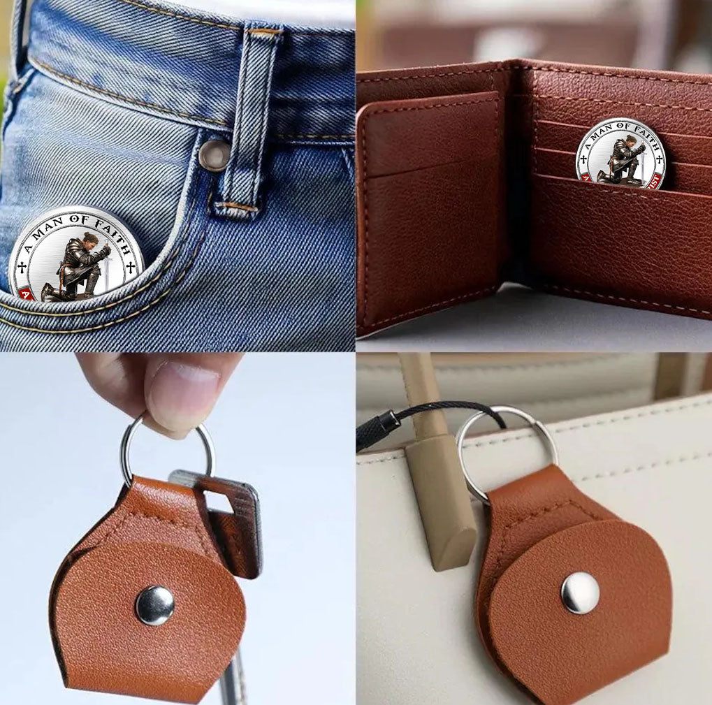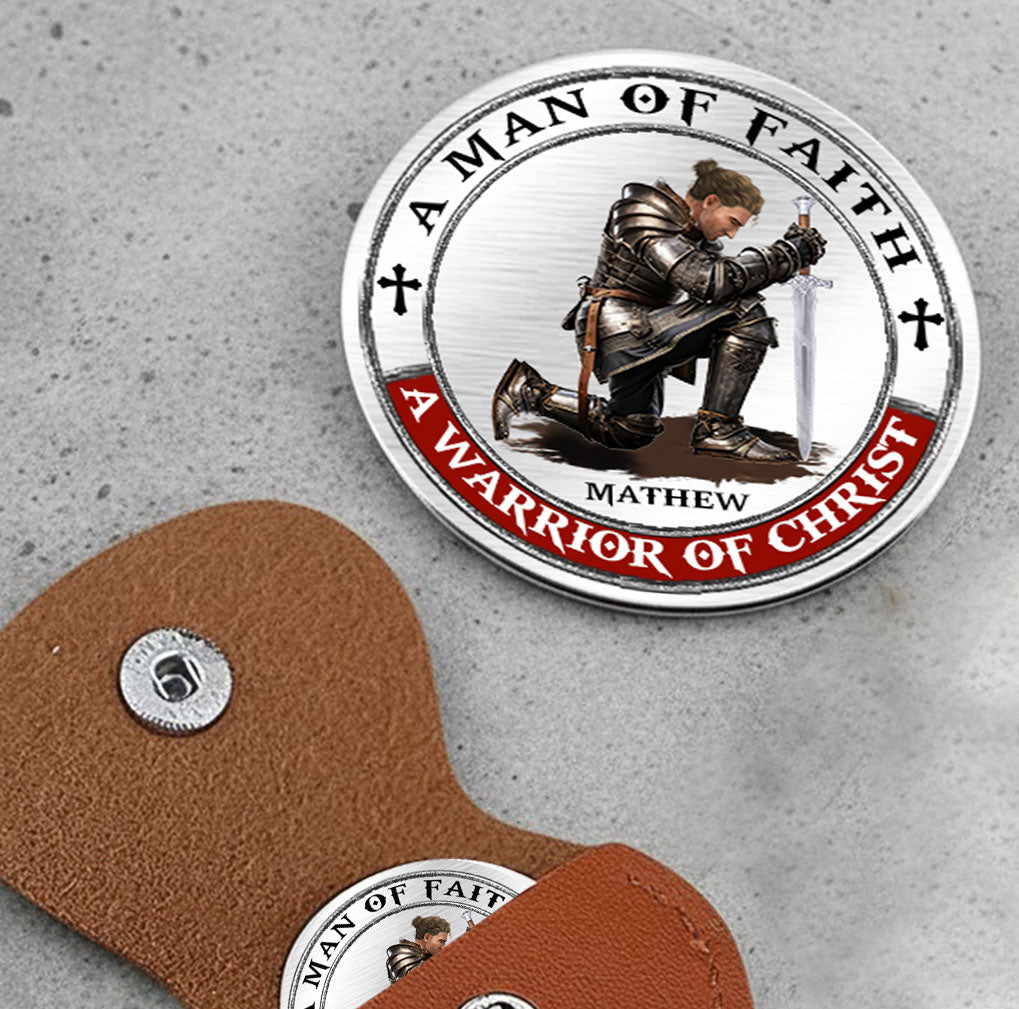If you’re looking for a small yet meaningful way to remind someone of their faith and inner strength, this Pocket Hug is made just for that purpose. Featuring the powerful quote “A Man of Faith – A Warrior of Christ,” this design honors a man who stands firm in belief and devotion to God. The artwork shows a warrior kneeling in full armor, holding his sword in prayer, symbolizing humility, strength through faith, and trust in God’s guidance. Fully personalizable with the warrior’s skin tone, hairstyle, and name, this pocket hug becomes a heartfelt gift for a husband, father, son, or any man who carries his faith with him every day.