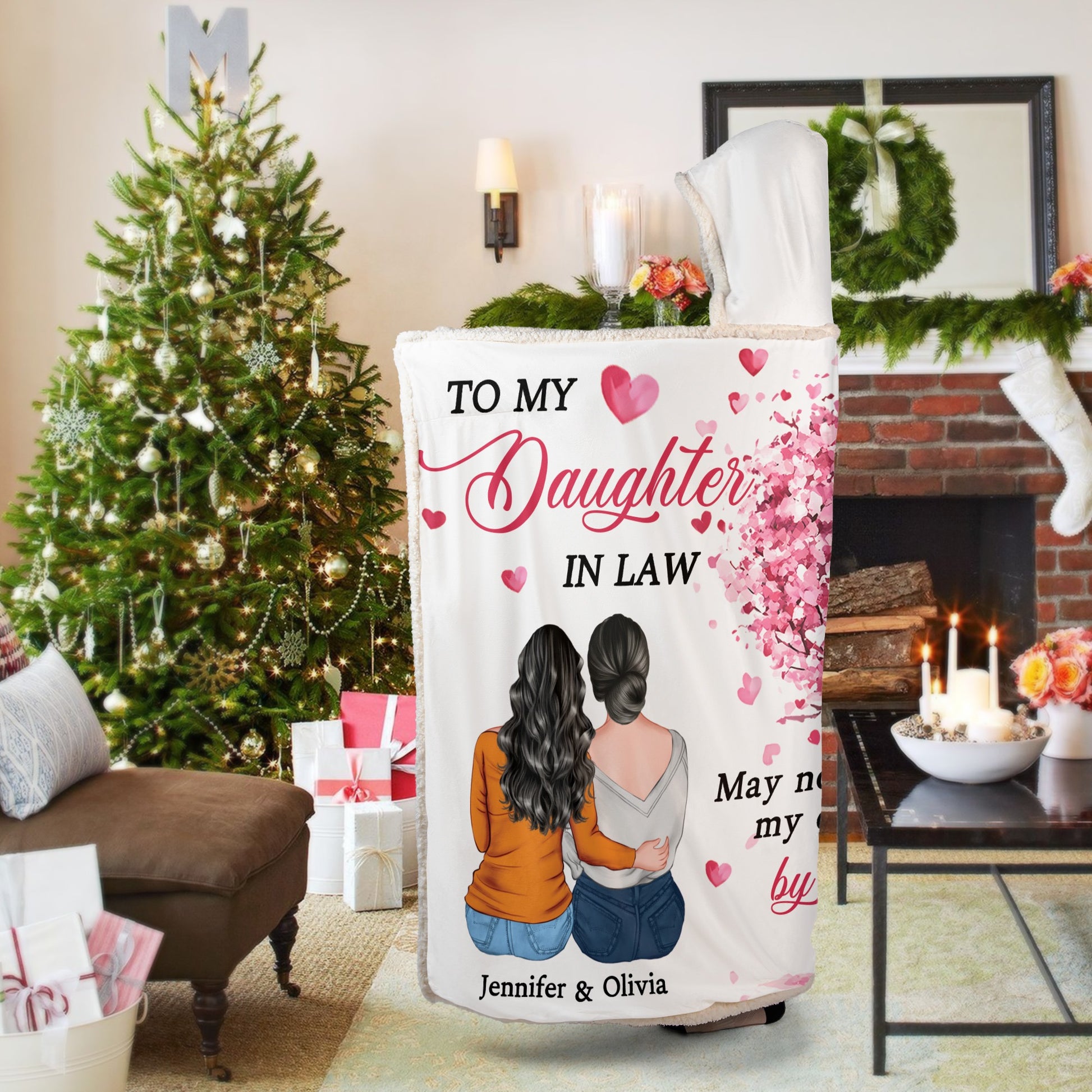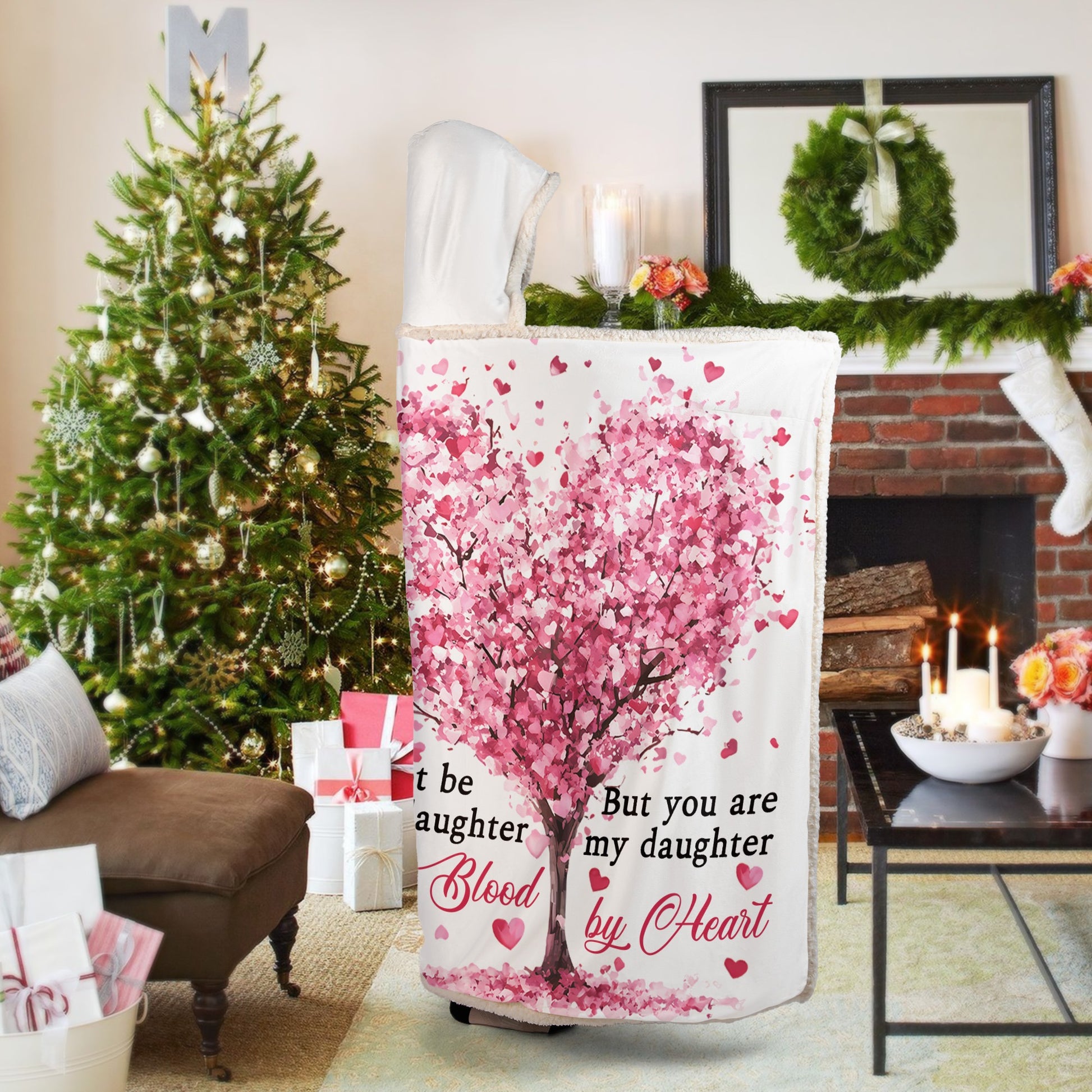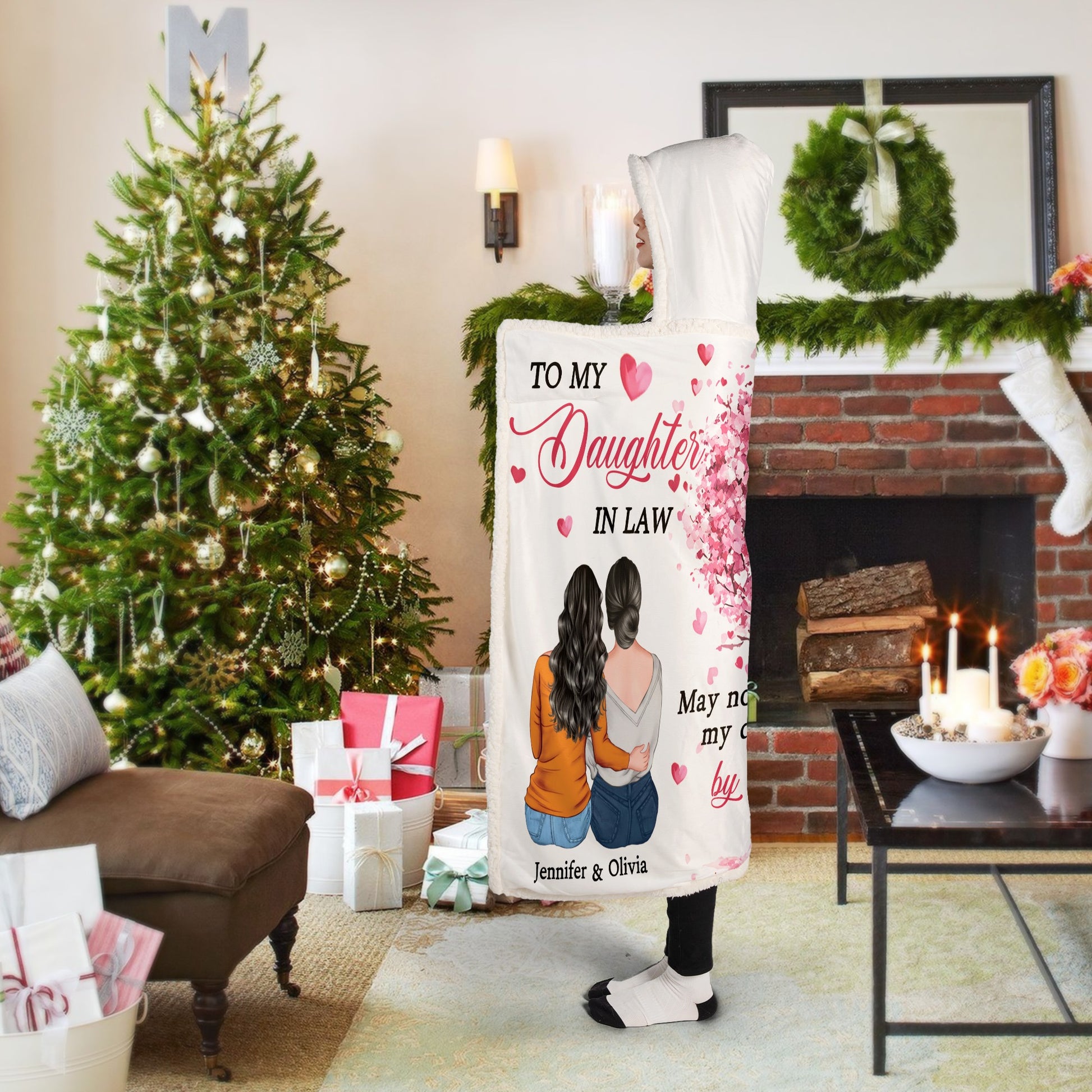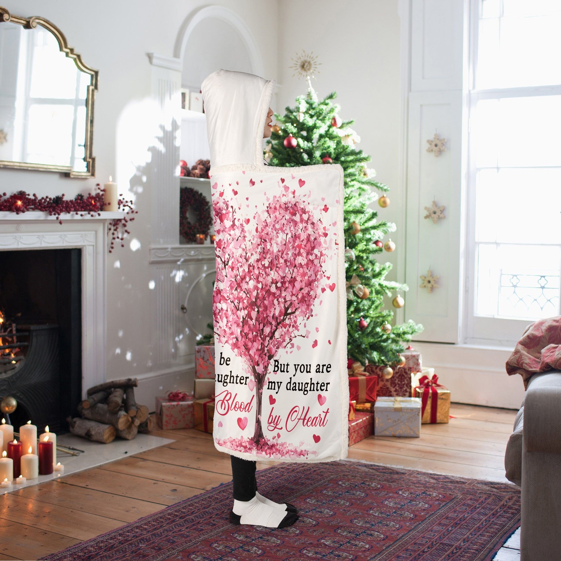 Have you found the perfect gift for your daughter-in-law for her birthday, wedding, or Christmas? Take a look at our Personalized Hooded Blanket, designed to express the deep love and bond between a mother and daughter-in-law. Featuring a heartfelt message: “May not be my daughter by blood, but you are my daughter by heart.” Wrapped in a blooming pink heart-shaped tree filled with love, the design shows a warm embrace between two women - symbolizing love, support, and connection beyond biology. This cozy and emotional blanket is more than just warmth, it’s a tribute to chosen family and unconditional love.