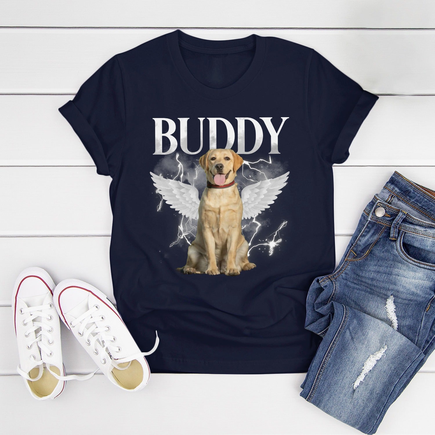 Honor the memory of your beloved furry friend with this Personalized Pet Memorial T-Shirt a heartfelt tribute for pet lovers who have lost a cherished companion. Featuring a custom photo-style image of your pet with angel wings and a celestial background, this shirt offers a comforting way to keep their spirit close to your heart. The bold, radiant design and high-quality print capture both strength and tenderness, making it a perfect remembrance gift.