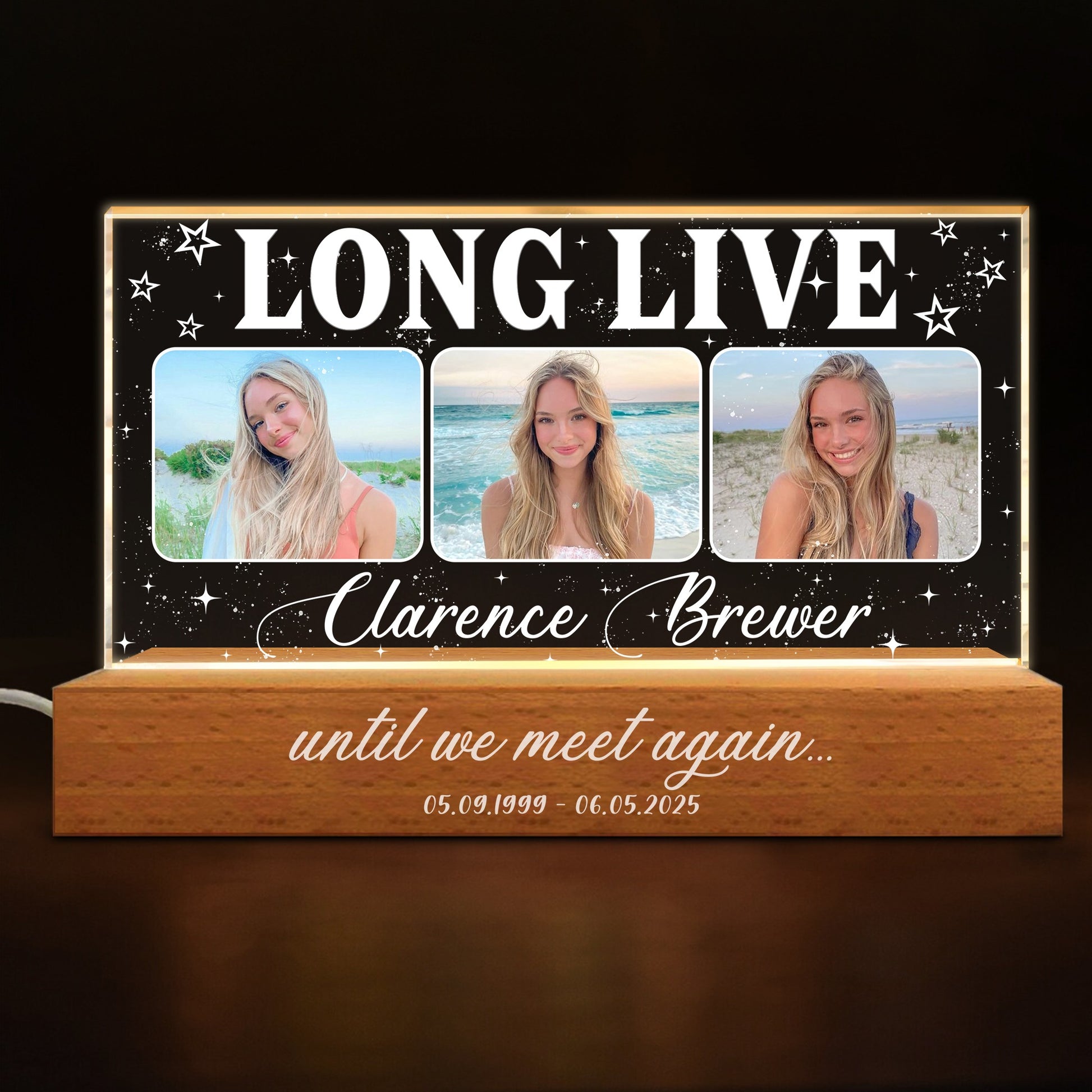 Honor the memory of your loved one with this Personalized Memorial Acrylic Plaque LED Night Light – a beautiful and heartfelt tribute that brings warmth and comfort during times of remembrance. Designed with the touching message "Long Live – Until We Meet Again", this night light offers a serene space to showcase cherished photos of someone special you've lost. The clear acrylic plaque, illuminated gently from a wooden LED base, creates a glowing display that serves as a constant reminder of love that never fades.