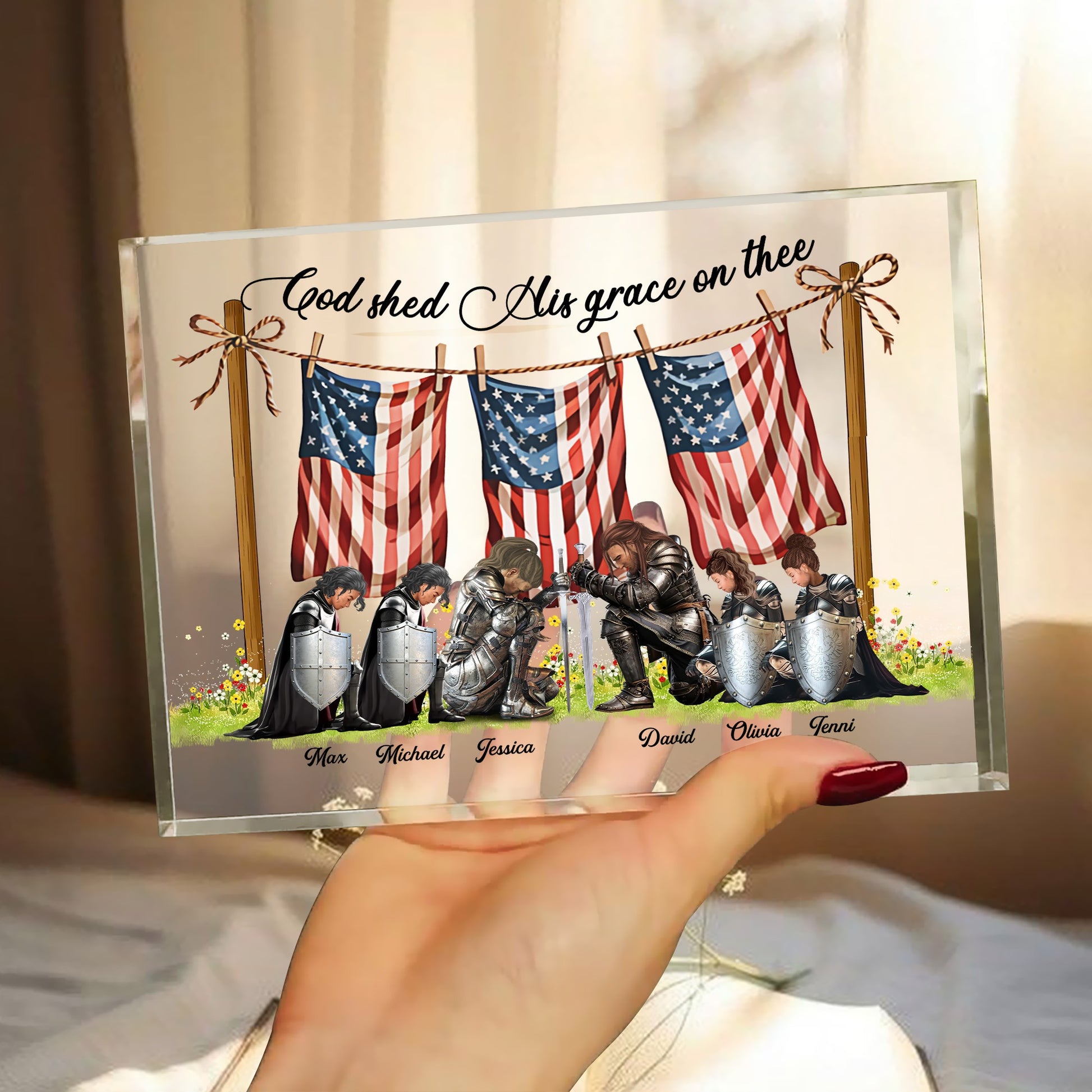 Looking for a heartfelt way to honor your family’s faith? This personalized acrylic block plaque is a meaningful gift that beautifully reflects the strength, unity, and spiritual devotion of a God-centered family. Featuring a powerful scene of a family of warriors kneeling in prayer beneath gently swaying American flags, this design captures the spirit of unwavering belief. Each figure is adorned in the Full Armor of God, symbolizing divine protection and courage. Above them, the inspiring message “God shed His grace on thee” serves as a daily reminder of God’s unfailing love and mercy. Whether displayed in the living room, entryway, or prayer space, it brings beauty and spiritual strength to any home.