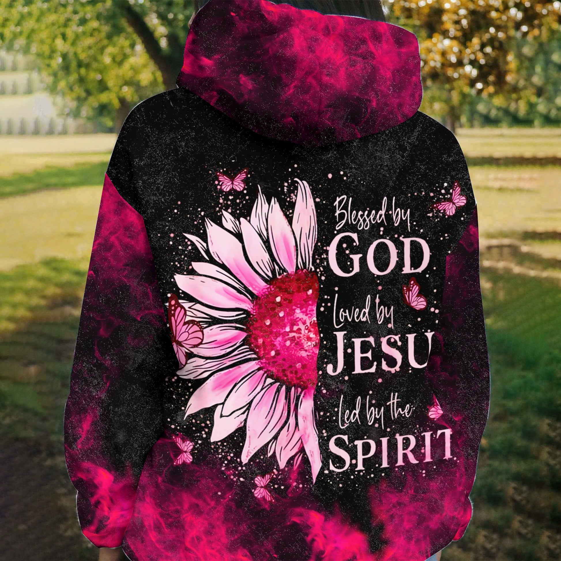 Celebrate your faith with this 3D All-Over Print Christian Apparel, designed to inspire and uplift believers. Featuring the powerful message "Blessed By God, Loved By Jesus, Led by The Spirit," this design beautifully symbolizes devotion and trust in God's guidance. The artwork showcases a stunning pink sunflower with a glittering heart at its center, surrounded by delicate butterflies and a cosmic-inspired black-and-pink background. This eye-catching, faith-filled design makes a meaningful statement, whether for personal wear or as a heartfelt gift for loved ones.