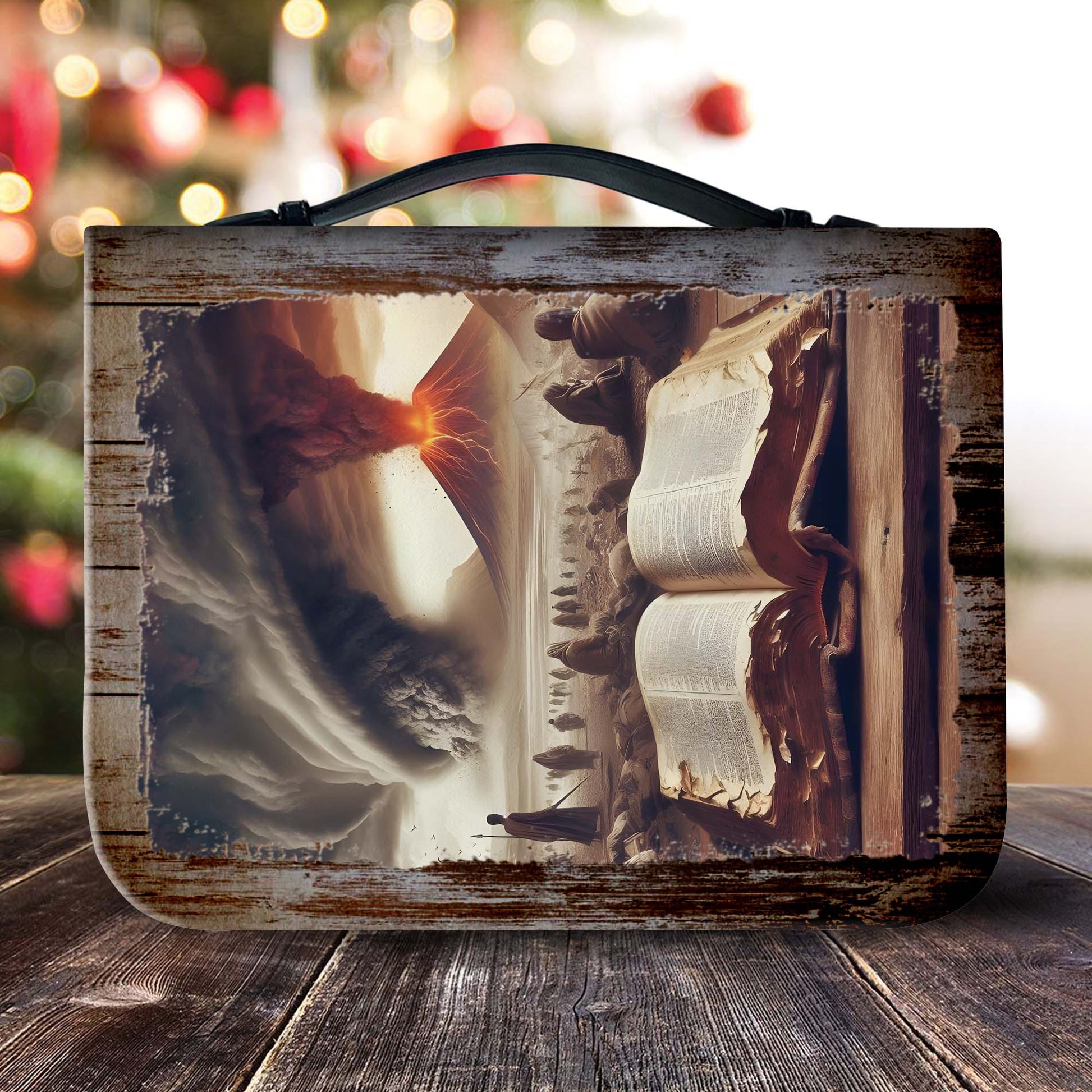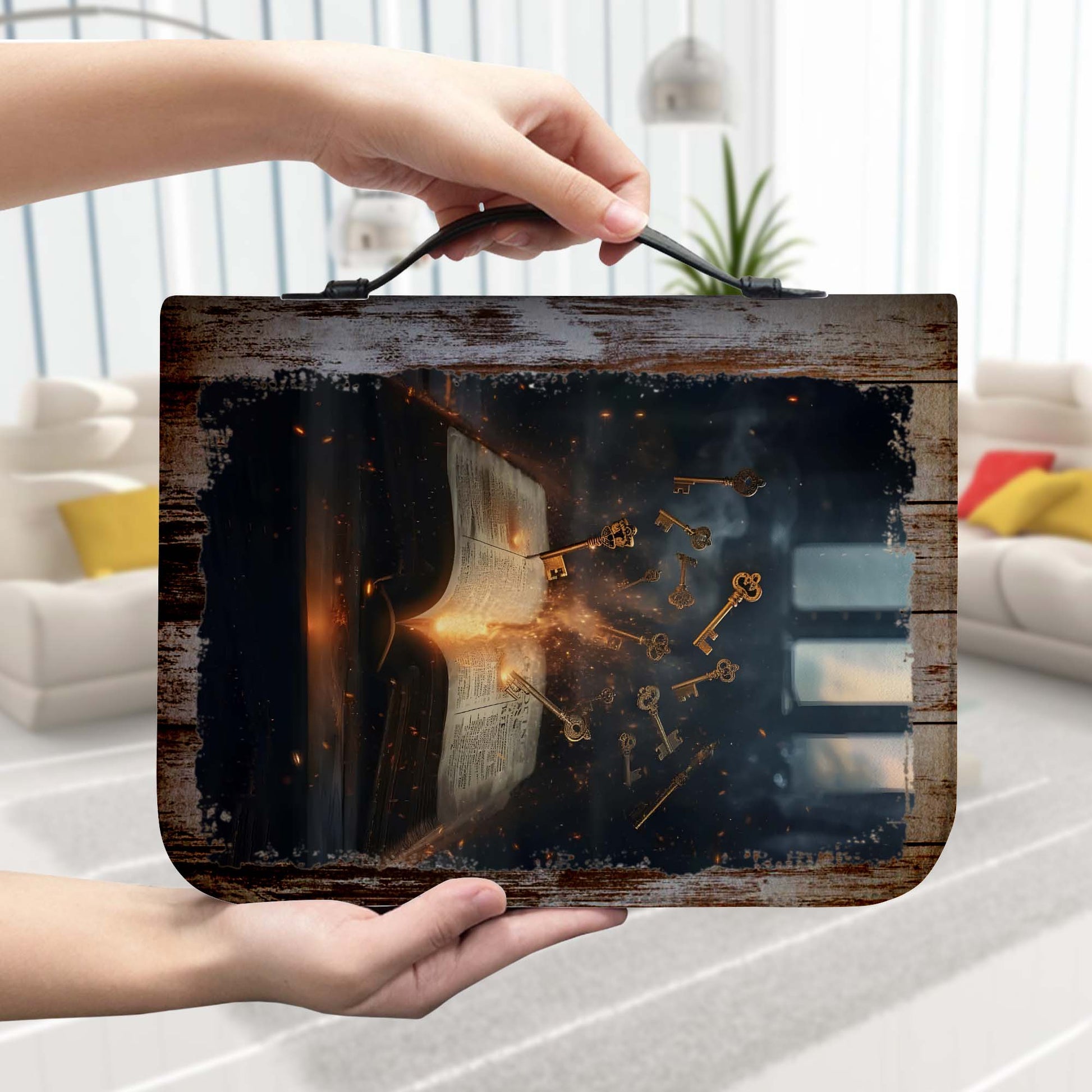 Protect your Bible with a stunning blend of artistry and inspiration. This Leather Bible Cover features a captivating 3D illustration that brings Scripture to life: an open Bible glowing with divine keys on the front, symbolizing revelation and faith, and a dramatic scene on the back of a volcano witnessed by people, evoking prayer, hope, and God’s power. The rustic wooden-frame effect adds depth and character, while the vivid imagery captures themes of wisdom, guidance, and spiritual awakening. Carefully printed on high-quality PU leather, the cover offers a smooth texture, vibrant colors, and long-lasting durability.